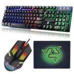 ゲーミングキーボードマウスとマウスパッドコンボセット – 人間工学に基づいたレインボーRGBバックライト USB 有線 PCノートパソコン用 ゲーム用 – キーボード、マウス、パッド(ブラック) |
