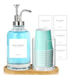 Ezebesta 17オンス マウスウォッシュ クリアガラスポンプディスペンサー 使い捨てマウスウォッシュカップホルダー 詰め替え可能 クリア容器 竹製トレイ付き マウスウォッシュラベル |