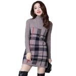 [CARLIE KLOSS] ワンピース ドレス パーティー セクシー 韓国風 カジュアル ニット ェック ハイネック 長袖 ミニ丈 ボディコン レディース ブラウン L |