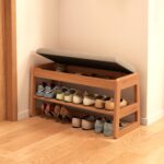 Mangowood 玄関ベンチ 無垢材 シューズラック 2段 – 蓋付き収納 靴脱ぎベンチ 木製 長椅子 クッション付き 省スペース 小物収納付き | 組み立て簡単 | 無垢材 | 玄関用 | 木目/木の色 | XD014 |