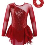 [RUNQHUI] 子供用の女の子向けのきらきらしたシークインス入りのフィギュアスケート用ドレス 长袖 バックに切り抜きデザイン 体操用レオタード ヘアタイ付き 赤 6 |