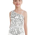 [Yeahdor] 袖なしの体操競技用 片肩スタイルのステージパフォーマンス用 シークイン入りの女の子用 フィギュアスケート用 子供向けダンスウェア 銀 14歳 |