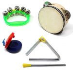 子供 楽器 4点 セット (本革 タンバリン + トライアングル + カスタネット + ハンドベル) リトミック 定番 おもちゃ 知育 教育 |