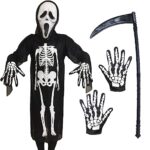 [Formemory] ハロウィン コスプレ 骸骨 仮装 死神 鬼 幽霊 コスプレ 衣装 スクリームマスク 肝試し 怖い 恐怖 雰囲気づくり 定番 豪華4点セット (骸骨マント+骨柄手袋+スクリームマスク+武器模型の道具 斧/大鎌/風船ナイフ)小道具 大人用 子供用 男女兼用 ハロウィンコスプレ イベント学園祭 (骸骨マント+大鎌 子供用 90) |