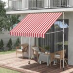 オーニング・シェード オーニングテント 日よけ 巻き取り式 サンシェード オーニング ひさし 紫外線 UV カット 目隠し 目かくし 遮光 クールサマーオーニング 角度 高さの調節が可能 簡単設置 アーム伸縮タイプ (ホワイトのポールレッドとホワイトのストライプ布, 幅200cm)