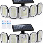 リモコン付きソーラーアウトドアライト、300LED 2700LM 5ヘッドソーラーパワーモーションセンサーLEDセキュリティライト、IP65防水LEDフラッドライト、360°ビームアングルウォールライト、ガーデンドライブウェイヤード用2パック
