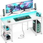 AODK ゲーミングデスク パソコンデスク コンセント&LED付き 机 pcデスク 幅120cm 両側ラック&モニター台付き 勉強机 ゲームデスク computer desk ワークデスク オフィスデスク 長机 左右入れ替え対応 ホワイト