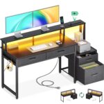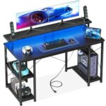 AODK ゲーミングデスク パソコンデスク コンセント&LED付き 机 pcデスク 幅120cm 両側ラック&モニター台付き 勉強机 ゲームデスク computer desk ワークデスク オフィスデスク 長机 左右入れ替え対応 ブラック