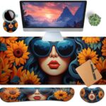 大型ゲーミングマウスパッド+キーボードリストレストセット、人間工学メモリーフォームマウスマットリストレストサポート、防水拡張マウスパッド31.5×11.8インチ、アフリカ系アメリカ人のかわいい女の子、ひまわりの女性デスクパッド。 |