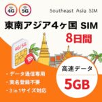 【東南アジア4ヶ国 SIM】8日間 5GB 高速データ通信 タイ・シンガポール・ベトナム・マレーシア 5G/4G simフリー端末のみ対応 説明書付 SIMピン付き prepaidSIM (SIM | 8日間 5GB) |
