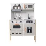 木製のおままごとキッチンセット。組立式でコンロ、冷蔵庫、電子レンジあり。本物みたいなピザや調理器具付き。3歳以上向けの知育玩具。入園祝い、誕生日プレゼント、クリスマスギフトに最適。