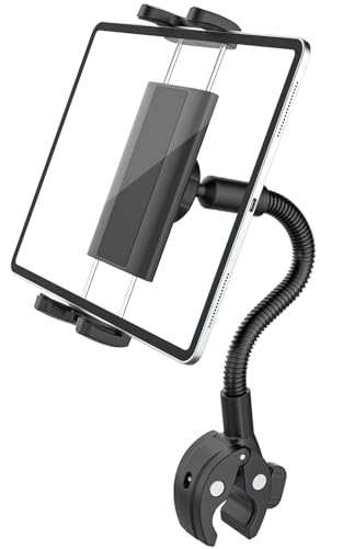 2025強化版のwoleyiエアロバイク用タブレットホルダーは、360度回転し、4-13インチの多機種(iPad Pro、iPhone等)に対応。安定性が高く、取り付けも簡単。日本語説明書付き。