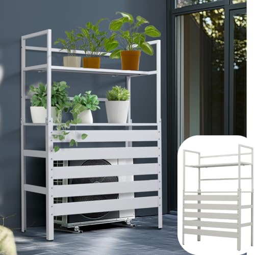 エアコン室外機カバーは幅89.5cm、収納ラック付きで、雨風や日よけに強い設計。スチールとアルミ製で屋外での使用に最適。収納庫としても機能し、ベランダや庭に最適な目隠しアイテムです。