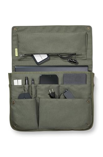 コクヨのバッグインバッグは、13.3インチのパソコンやA4サイズの書類が収納可能な横型クラッチバッグです。ビジネスシーンに適したオリーブグリーンのデザインで、BIZRACKシリーズに属します。