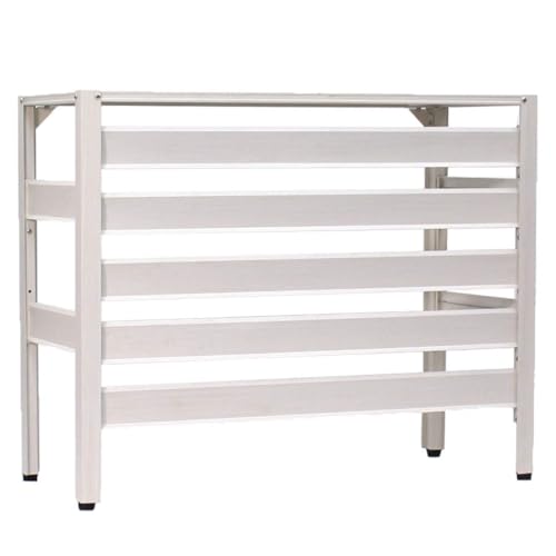 アルミ製エアコン室外機カバーKB-90Wは、幅90cm×奥行38cm×高さ73cmのサイズで木目調ホワイト仕上げ。耐久性があり、デザイン性も兼ね備えた実用新案登録商品です。