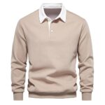 秋服メンズの長袖ポロシャツ。カジュアルでおしゃれなデザイン、ボタンダウンスタイル。サイズS、カラーはカーキ。秋冬のビジネスやゴルフにも最適。