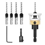 木工用ドリルビットセットは、皿取り錐と面取りカッターの5点組。8mmと10mmのサイズがあり、高硬度炭素鋼製。木ダボ穴加工や座ぐり、下穴開けに対応。鋭角ビットでハンドドリルや台ドリル兼用。家具製作やリフォームに最適。