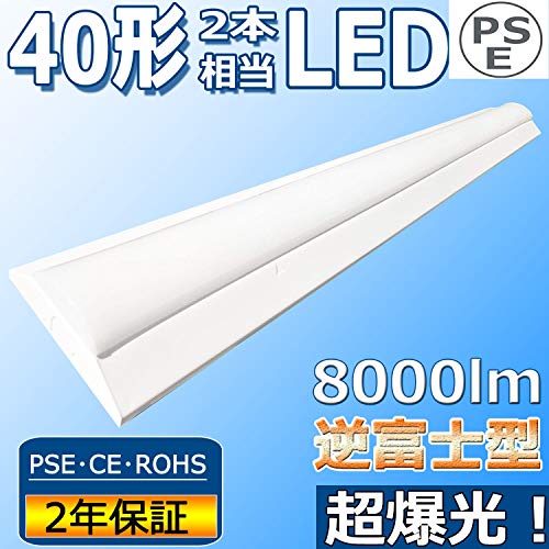 逆富士型LEDベースライト 40W形 昼光色6000K、消費電力50W、8000lmの高輝度照明。210度照射、1250mmサイズで、キッチンや天井直付けに最適。