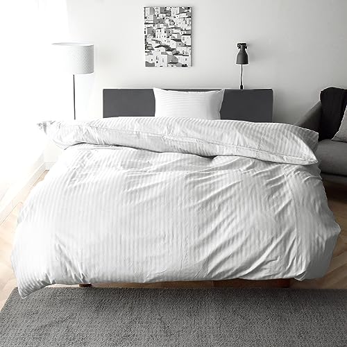 日本製のセミダブル布団カバーセット(3点)で、防ダニ効果あり。綿100%の高密度315本サテンストライプ生地使用。掛け布団カバー、ボックスシーツ、枕カバーが含まれ、北欧風でおしゃれなデザイン。色はスノーホワイトです。