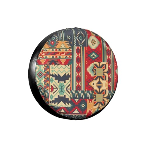 インディアンネイティブアメリカンデザインのオルテガ柄タイヤカバー。14-17インチ対応で、日焼けや劣化からタイヤを守ります。簡単取り付けでSUVやトラック、ジープトレーラーにも最適なカー用品です。