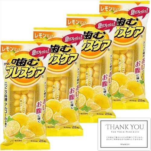 【4個セット】噛むブレスケアは、フレッシュなレモンとミントの風味で口臭対策に最適な25粒入り。手軽に持ち運べるサイズで、いつでもどこでもスッキリ感を実感できます。オリジナルショップカード付。
