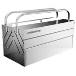 ステンレス製のツールバッグです。アルミ合金で高耐久、折り畳み可能なコンパクトデザイン。仕分け管理と収納ポケット付きで多機能。大工や作業に便利なストッパー付レンチ収納が特徴です。