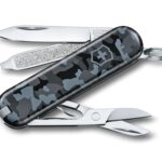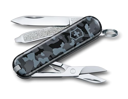VICTORINOX クラシック SD ネイビーカモフラージュは、スイス製のコンパクトなマルチツールです。はさみやマイナスドライバー、つめやすりを含む7機能を搭載し、軽量でアウトドアやキャンプに最適です。