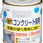 アサヒペン 水性コンクリート床用 0.7L ライトグレーは、ツヤありの高光沢仕上げで、1回塗りで塗膜が硬く、摩耗に強いです。防塵・防水機能を備え、耐ガソリン性もあり、ベランダやガレージなどのコンクリートに最適な日本製塗料です。