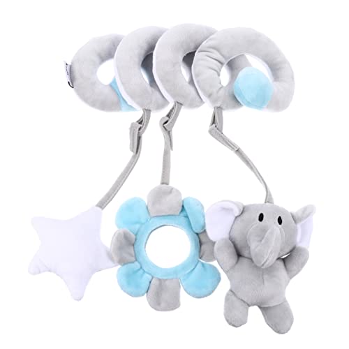 KOMBIUDAのスパイラルアクティビティおもちゃは、ベビーカーやカーシートに吊り下げて使用。赤ちゃんの興味を引き、楽しい時間を提供します。ぬいぐるみやグレーのデザインが魅力的。