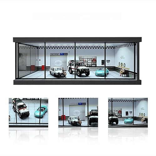 NUEIOVRWのジオラマカーガレージモデルは、LED照明付きの都市ショールームで、駐車場収納やダイキャストモデルが特徴。情景モデルとしての使い方も楽しめます。