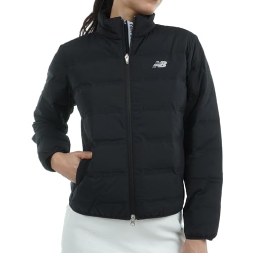 ニューバランスのレディースダウンブルゾン。撥水性、防風性、蓄熱保温性を備えたゴルフ用アウター。カラーはブラック、サイズはM。スタイリッシュで機能的な一着です。