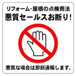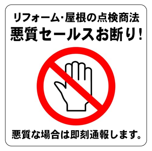 リフォーム屋根の点検商法による悪質セールスをお断りするためのラベルです。サイズは9cm×9cmで、6枚入り。しっかりした自己主張が可能で、訪問販売対策として活用できます。
