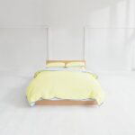 offtime(オフタイム)のバイカラー布団カバーセット、セミダブルサイズ。イエローとパープルの組み合わせで、おしゃれなデザイン。掛け布団カバー、ボックスシーツ、枕カバーが含まれ、パイピング付きで高級感があります。