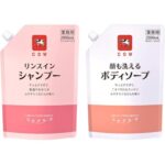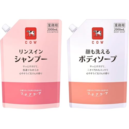 カウブランドのリンスインシャンプーと顔も洗えるボディソープの業務用セット。各2000ml入りで、心やすらぐ石けんの香りが特徴。健やかな髪と肌のためのアイテムです。