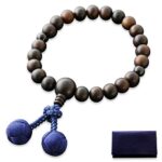 京仏壇はやしの男性用数珠は、正絹のくみひも梵天房と素挽縞黒檀を使用。2天青虎目仕立てで、全ての宗派で使用可能な製品です。数珠袋セット付き。