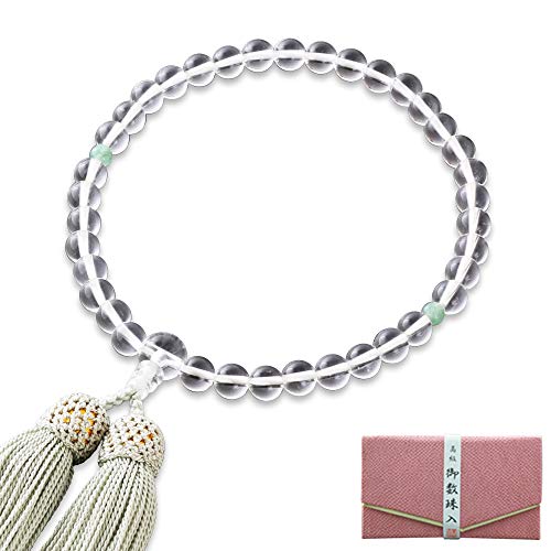 京仏壇はやしの女性用正絹数珠は、本水晶と印度翡翠を使用し、すべての宗派で使用可能。頭房は2天付き。数珠袋セットで、京都の伝統を感じられる逸品です。