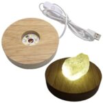 Sugarello LEDライトディスプレイは、鉱石や水晶、蛍石の美しさを引き立てる木製の原石ディスプレイです。USB接続で昼光色の照明が特徴の円形100mm台座です。