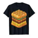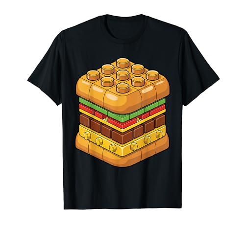 ハンバーガーブロックを使ったクリエイティブなビルディングが楽しめるTシャツ。レンガビルダーに最適なデザインで、ファンやお子様にも喜ばれるアイテムです。