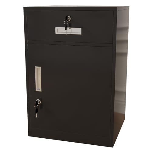 鍵付きのスチール製オフィスキャビネット。大容量収納で耐荷重100kg、防水・防錆・防犯設計。静音スライドレール搭載。学校や企業に最適な完成品です。サイズは44*39*65cm、カラーはブラック。