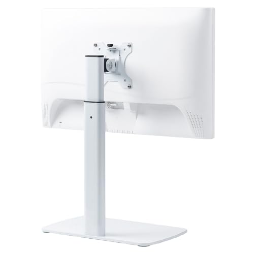 サンワダイレクトのモニタースタンドは、32インチ対応で耐荷重10kg。高さ・角度調整が可能で、自立式の置き型ディスプレイスタンド。シンプルなホワイトデザイン。