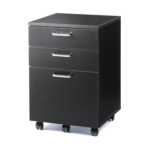 サンワダイレクトのデスクワゴンは、木製でキャスター付きの3段タイプ。A4サイズに対応し、幅40×奥行43.2×高さ60cmのコンパクト設計。カラーはブラックで、チェストやキャビネットとしても使用可能です。