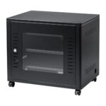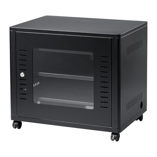 サンワダイレクトの機器収納ラック(100-SV037BK)は、幅60cm、奥行45cm、高さ53cmの小型サーバーラックです。鍵付きでセキュリティを強化し、棚板3枚を備えています。ルーターやNASの収納に最適です。