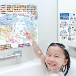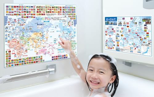 ヨーロッパ拡大地図を含む世界地図お風呂ポスター2枚セット。防水仕様で、浴室や子供部屋に最適。楽しく学べるデザインで、地理教育にも役立ちます。