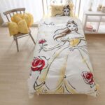 ディズニー「美女と野獣」ベルデザインの布団カバー3点セット。シングルサイズで、掛布団カバー、シーツ、枕カバーが含まれています。寝室を華やかに演出します。