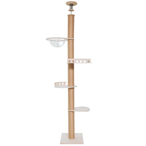 アイリスプラザの突張式キャットタワーは、透明ハンモックや爪とぎ機能付き。バルコニー設計で猫が遊びやすく、安全にアスレチック体験ができます。