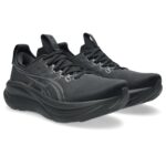 アシックスのGEL-NIMBUS 28は、ブラックとグラファイトグレーのカラーデザインで、28.0 cmの2E幅を特徴とするメンズランニングシューズです。優れたクッション性と安定性を提供し、快適なランニング体験を実現します。