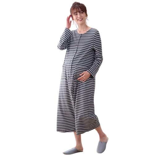 [ベルメゾン] マタニティパジャマは、授乳対応の2WAYデザインで、綿素材の長袖前開きワンピース型。産前産後に適したルームウェアで、カラーは杢チャコール×オフホワイトボーダー。サイズはL~LLです。