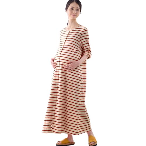 ベルメゾンのマタニティパジャマは、授乳対応の2WAYデザインで、綿素材を使用。長袖の前開きワンピースタイプのロンパースで、産前・産後に最適。オフホワイトとサーモンピンクのボーダー柄、サイズL~LL。