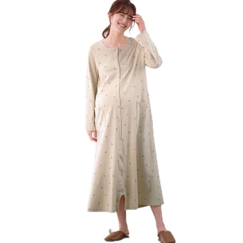 [ベルメゾン] マタニティパジャマは、授乳対応の2WAYデザインです。綿素材で快適な着心地、長袖の前開きワンピース型。産前産後に使えるルームウェア。色はベージュ系花柄、サイズはマタニティL~LLです。