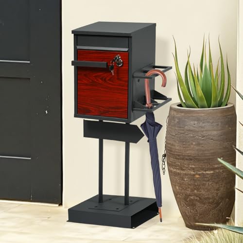 Kennkari 宅配ボックスは、置き型で傘立て付き、鍵付の郵便ポスト一体型。幅32cm、奥行24cm、高さ89cmのサイズに、ダークグレーと木目調のデザインが特徴。複数投函可能で、取っ手付きの新聞受け付き。